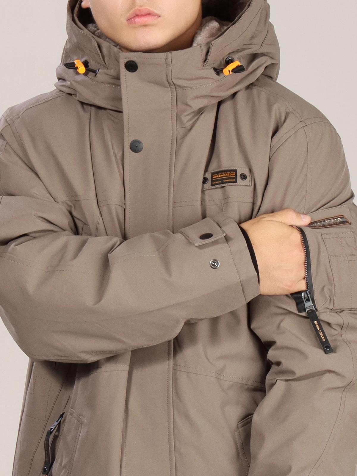 Для удобства предусмотрены боковые и нагрудные карманы на молнии, а также карман на рукаве — идеальное решение для хранения мелочей и личных вещей. Ветрозащитная планка надёжно защищает от продувания и помогает сохранить тепло внутри.