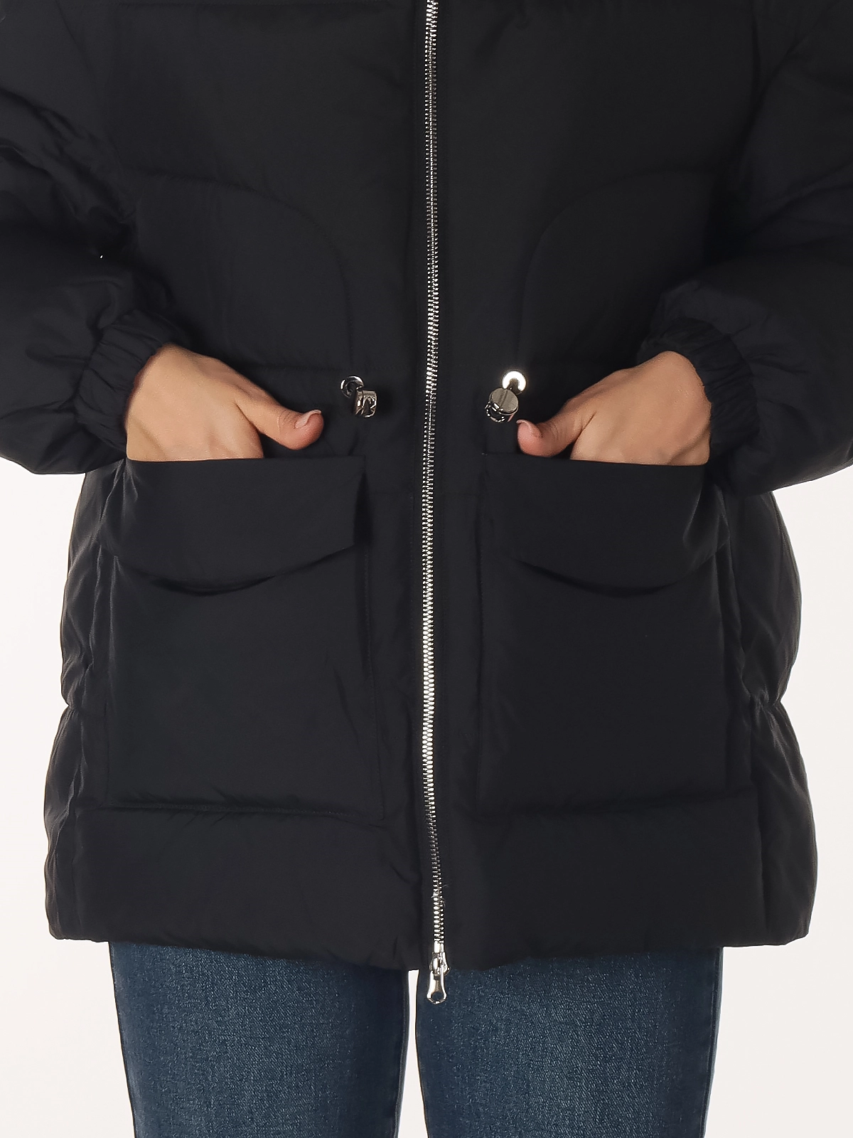 Практичные накладные карманы позволяют хранить мелочи, а карман внутри куртки обеспечивает безопасное хранение личных вещей. Утяжка на талии помогает регулировать посадку и подчеркивает силуэт.