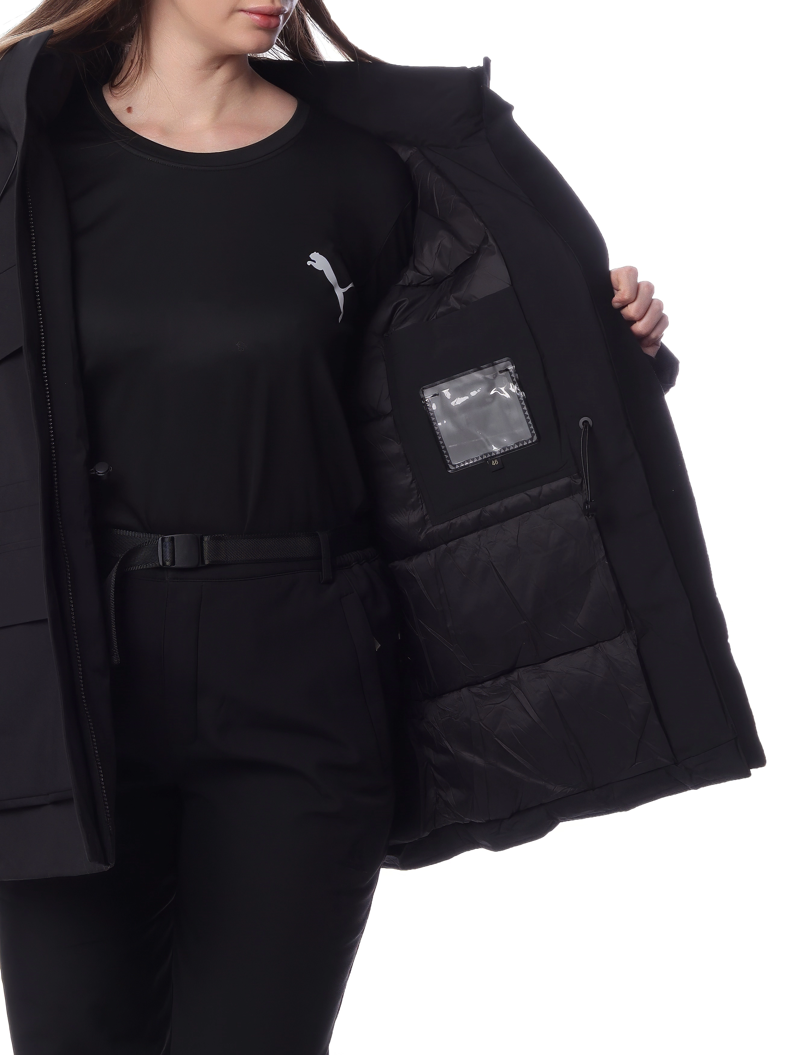 - Карманы: 4 внешних (2 накладных с клапанами, 2 боковых), 2 внутренних (один с прозрачным окошком)
