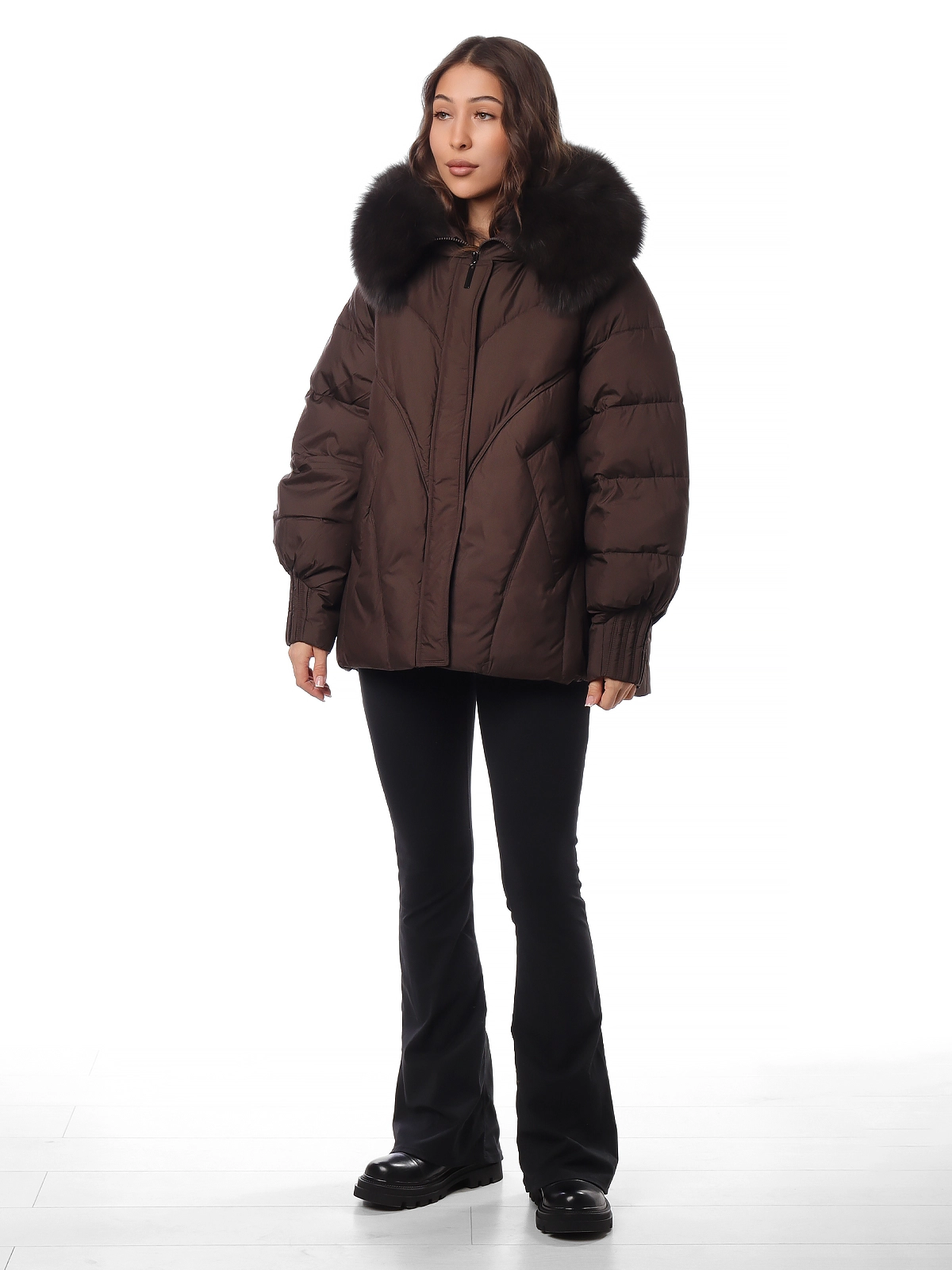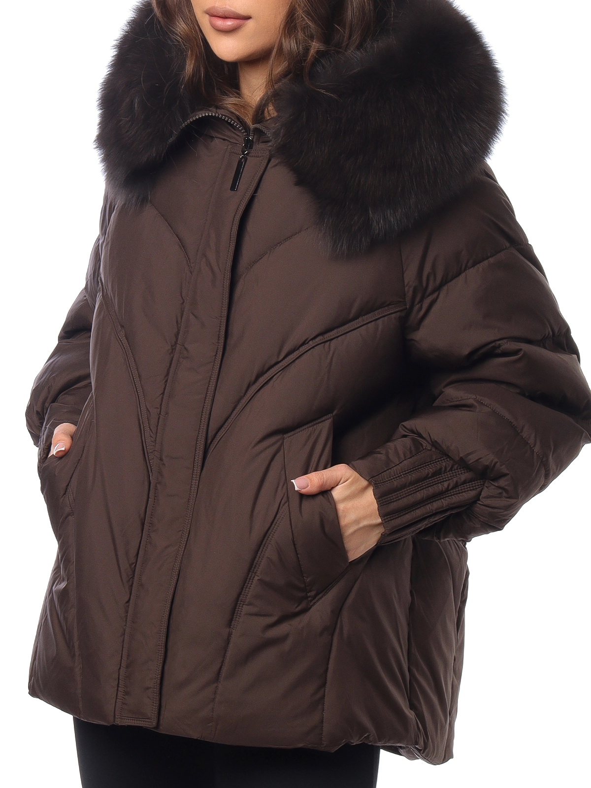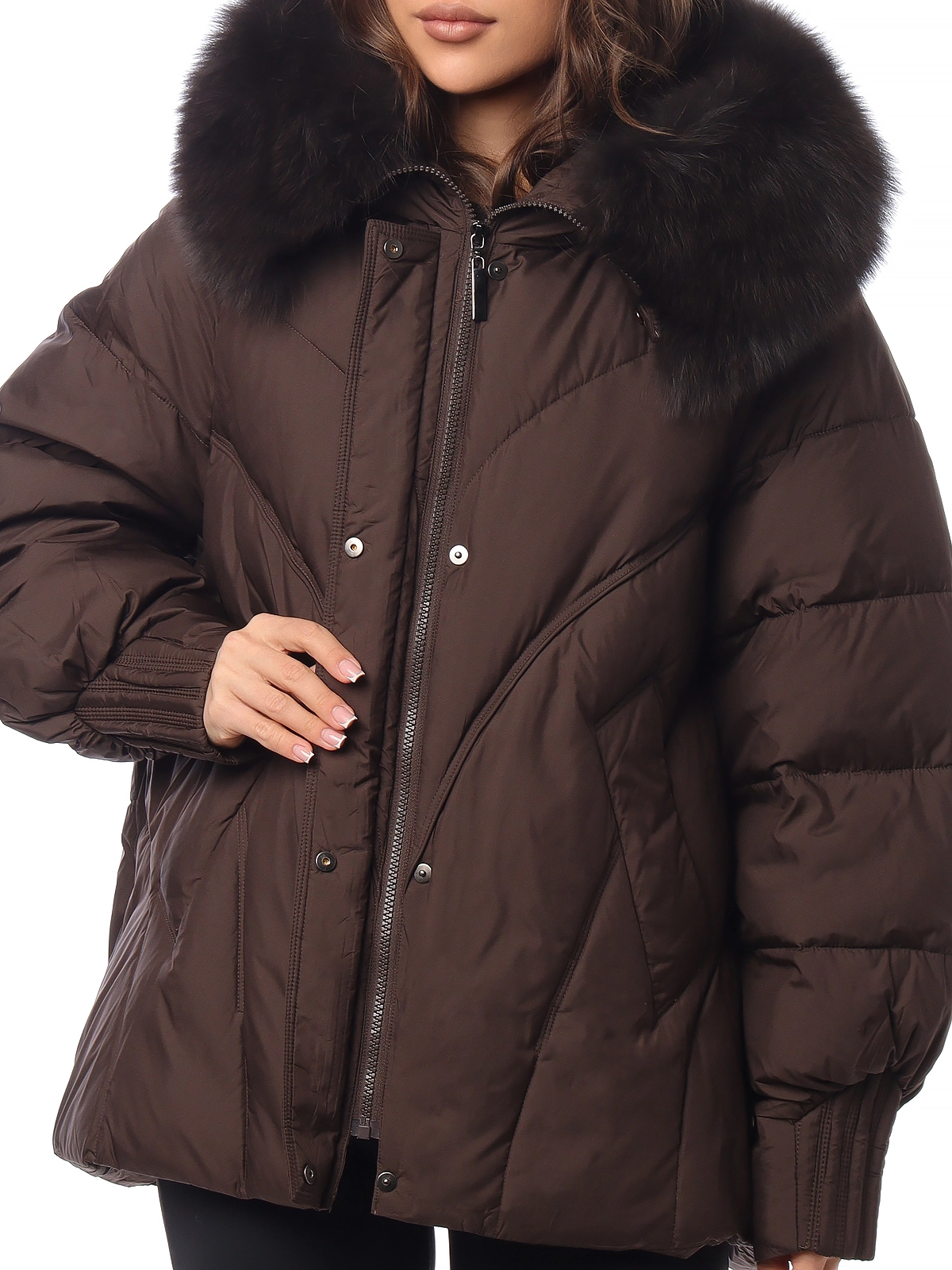 Главный акцент куртки – объемный капюшон с богатой меховой опушкой, который не только великолепно выглядит, но и надежно защищает от ветра и мороза.