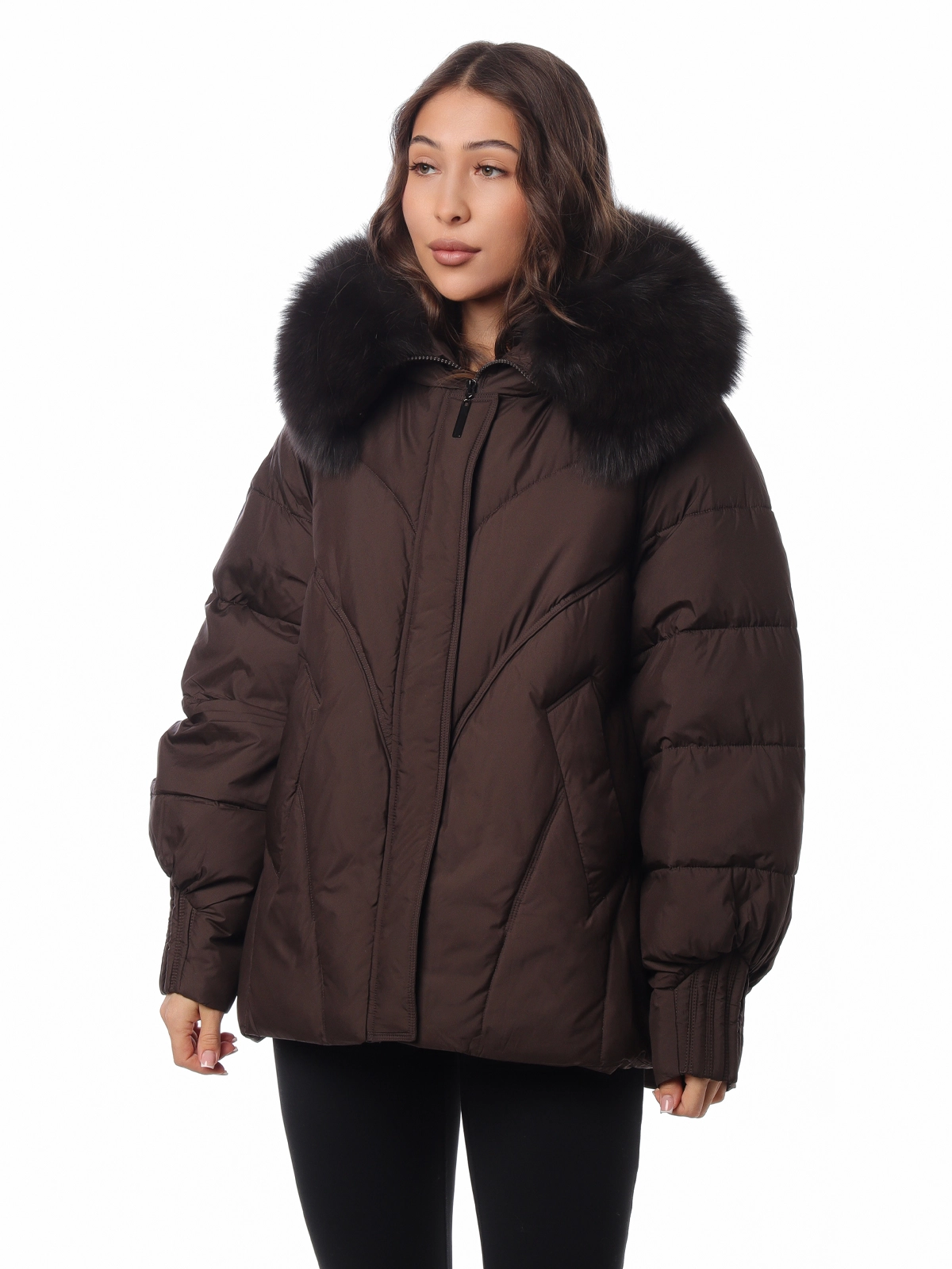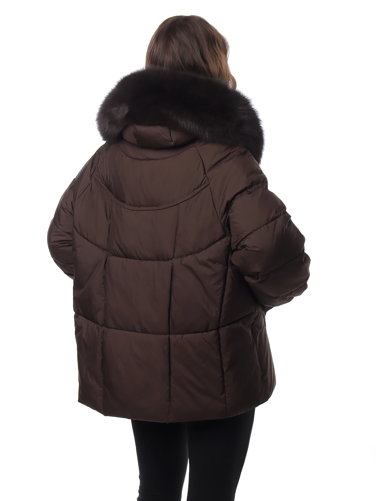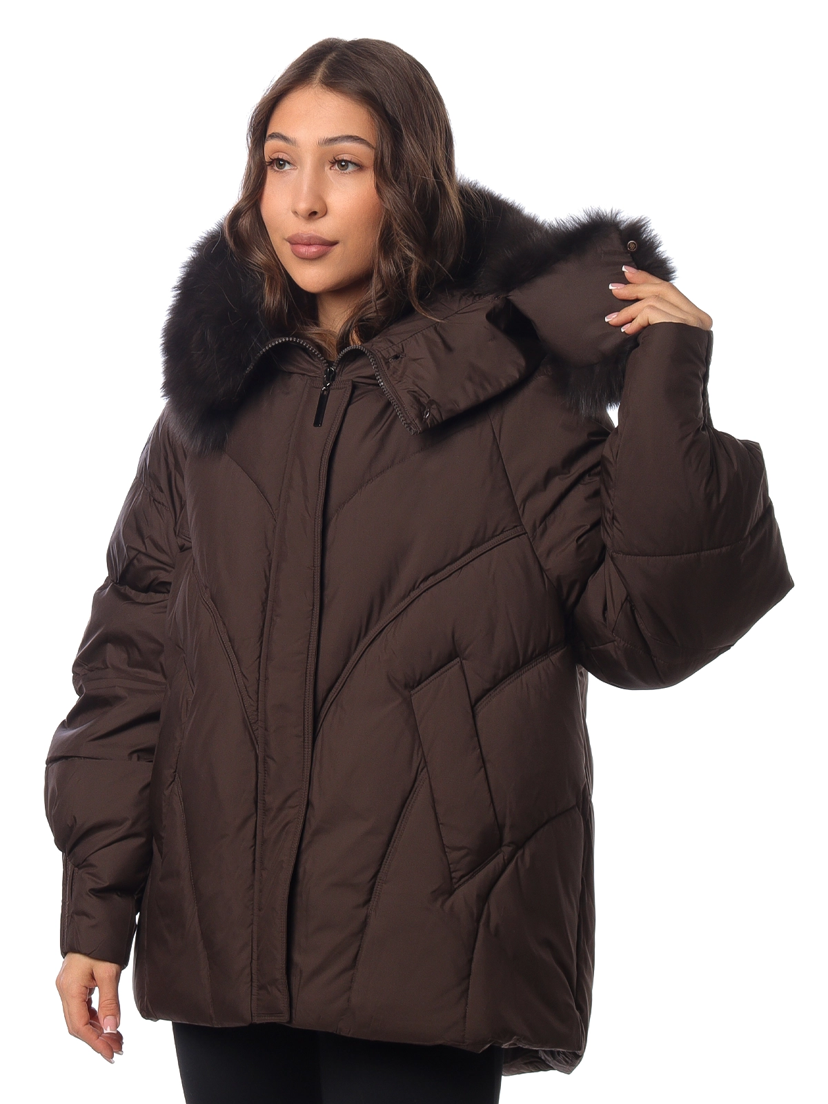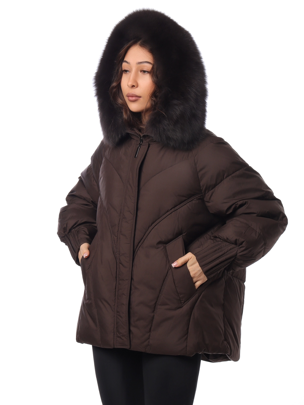 Главный акцент куртки – объемный капюшон с богатой меховой опушкой, который не только великолепно выглядит, но и надежно защищает от ветра и мороза.