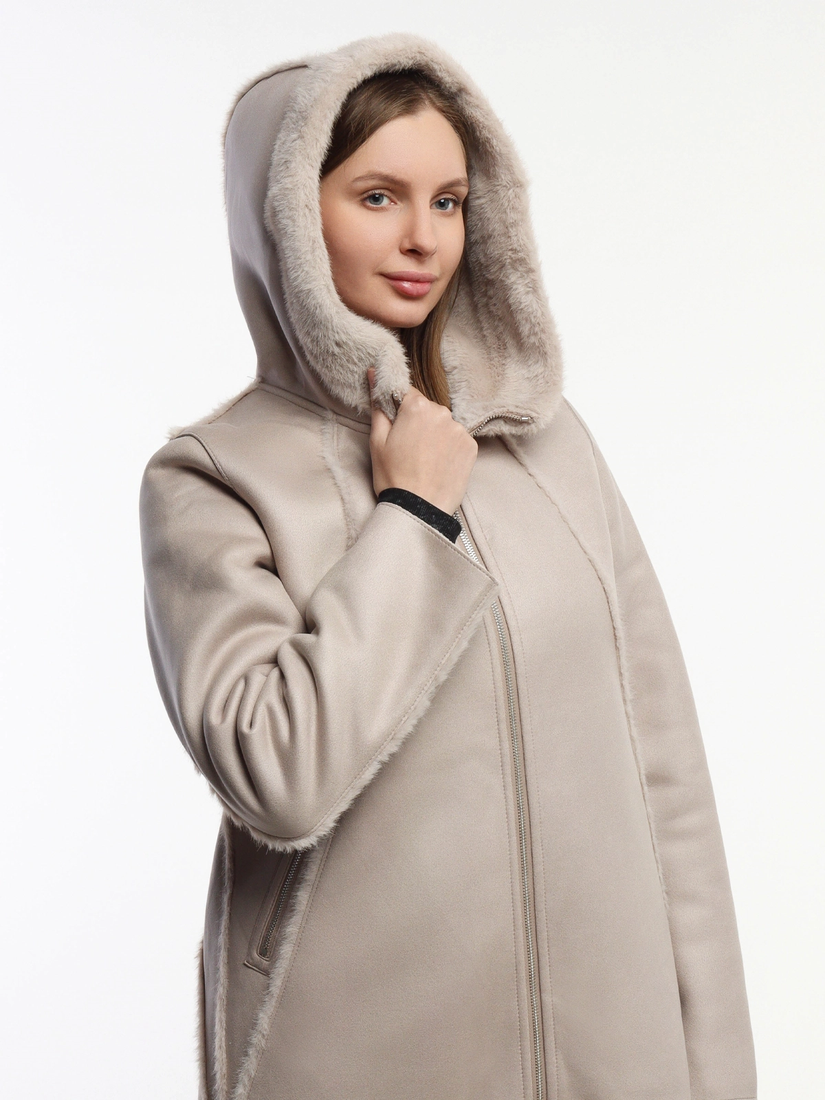 - Фасон: удлинённая модель с несъёмным капюшоном для дополнительной защиты от ветра и холода.