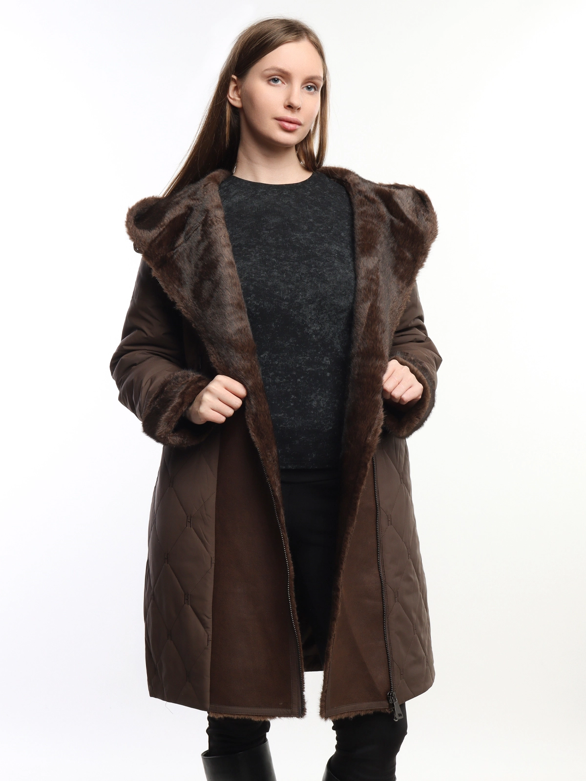 Верх выполнен из полиэстера с добавлением верблюжьей шерсти, что обеспечивает тепло и приятные тактильные ощущения. Модель оснащена несъёмным капюшоном и боковыми карманами, которые защитят руки от холода и добавят функциональности.