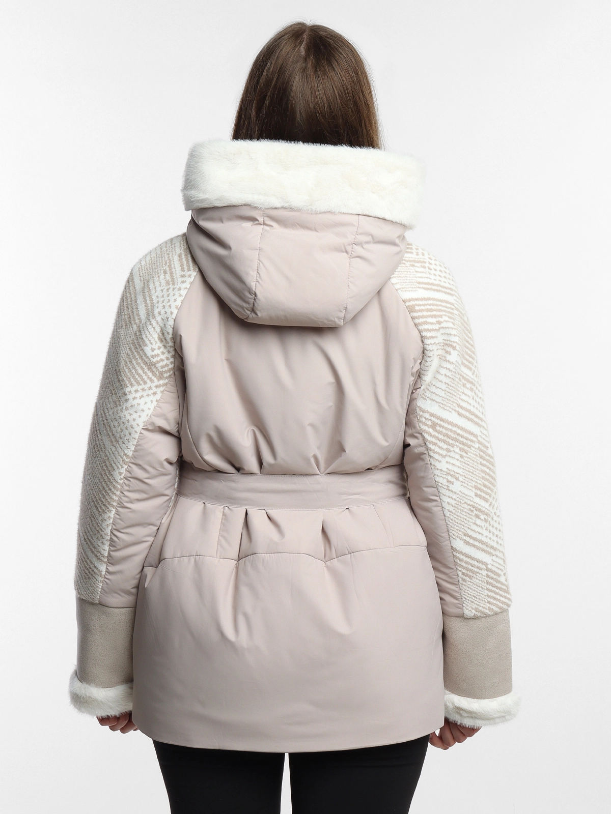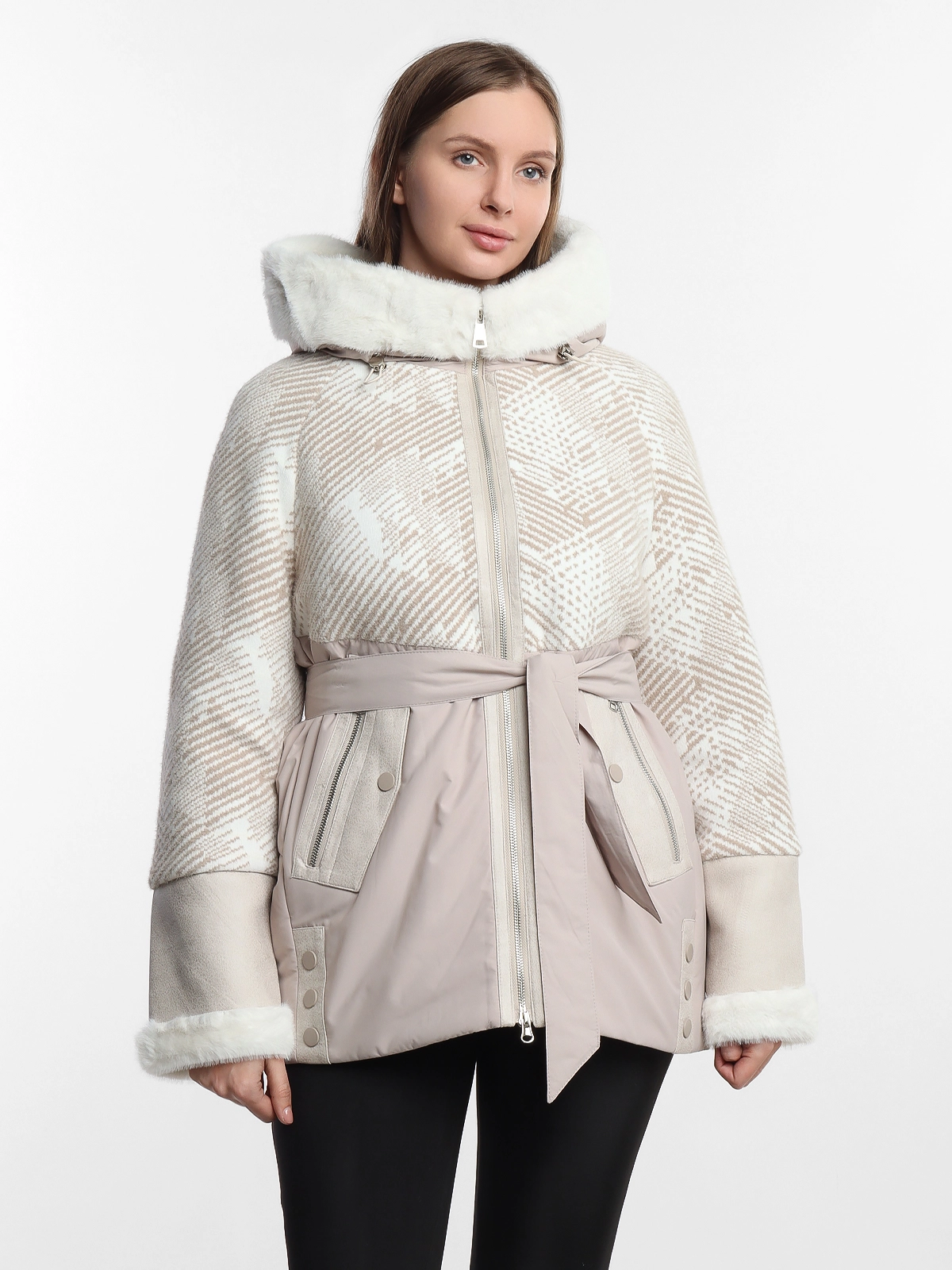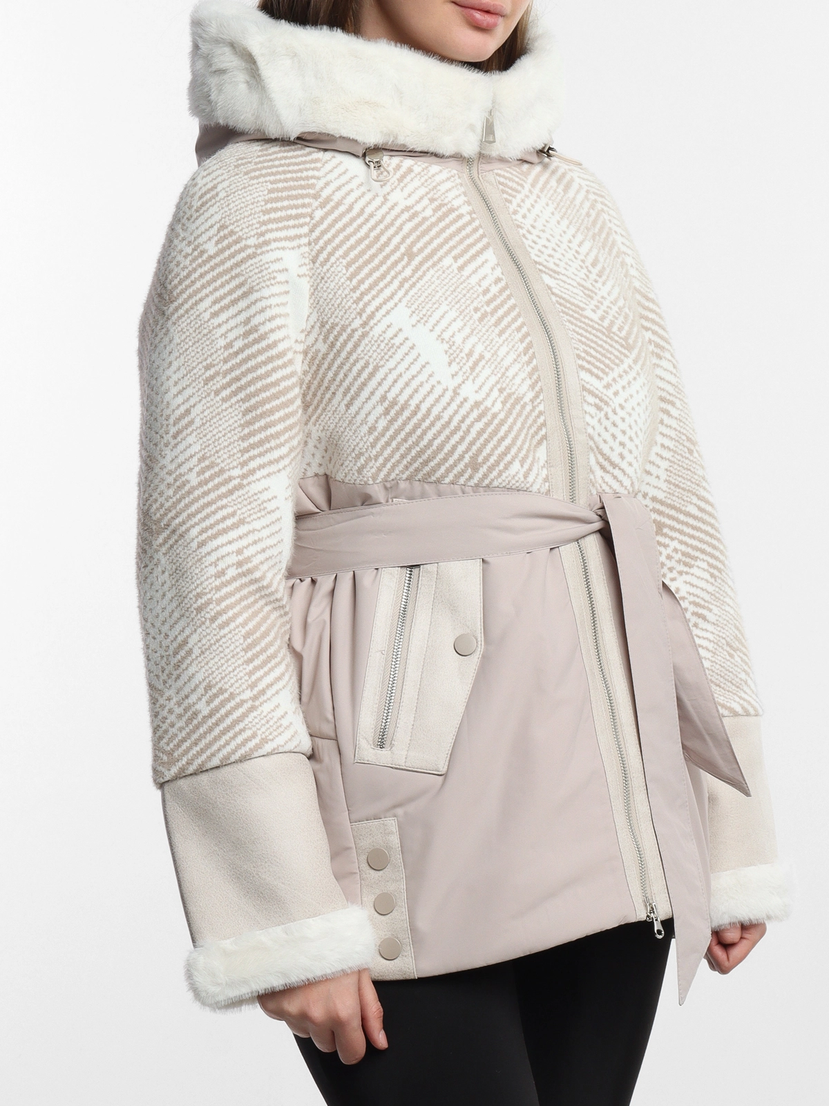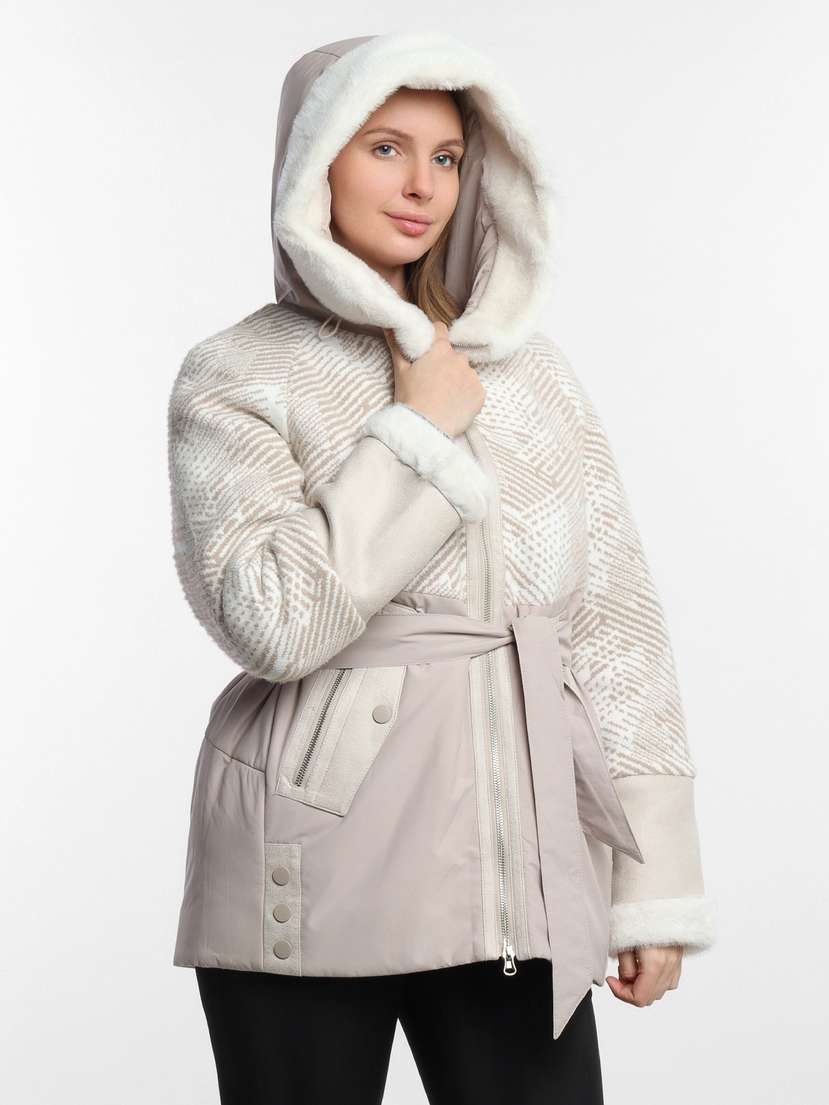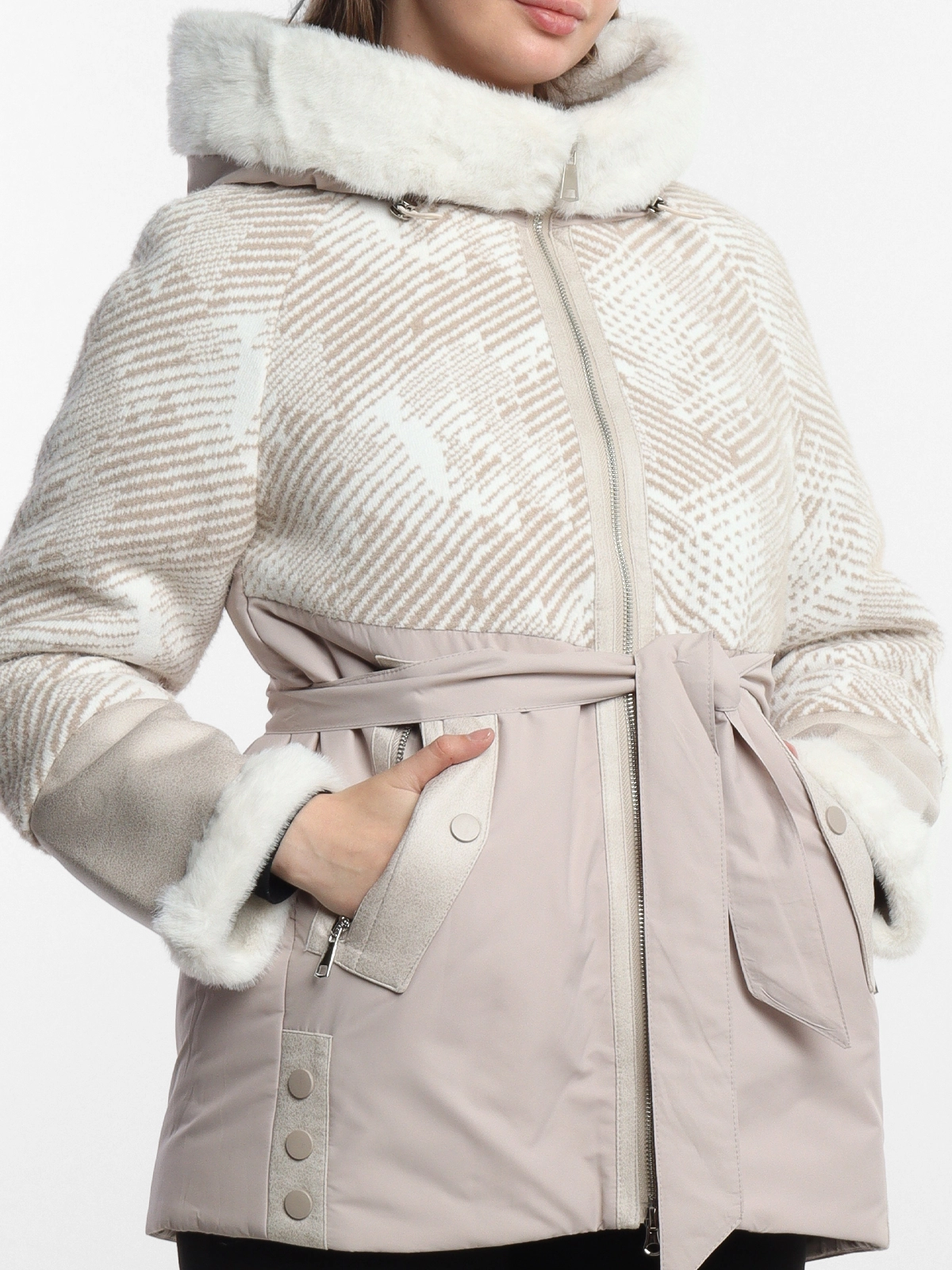 Модель оснащена несъёмным капюшоном, который защитит от ветра и осадков, а также поясом в комплекте, подчёркивающим талию и создающим женственный силуэт. Боковые карманы на молнии обеспечивают удобство и безопасность для мелочей.