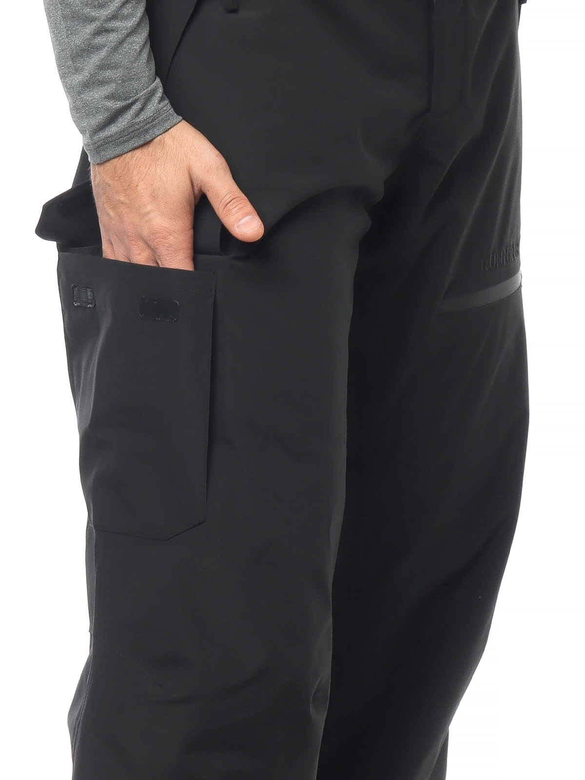 - Асимметричная система карманов: на правом бедре — объемный карман с клапаном на липучке, на левом — врезной карман на влагозащитной молнии;