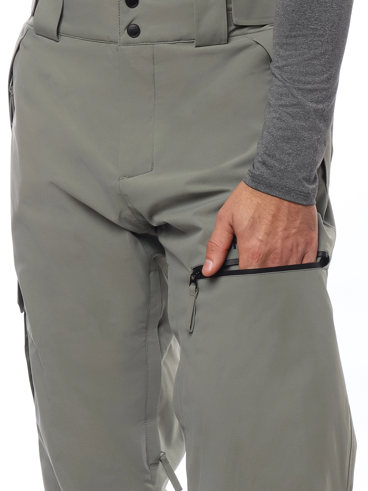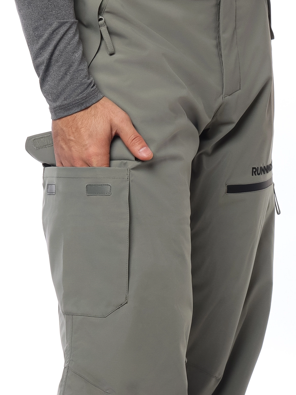 - Асимметричная система карманов: на правом бедре — объемный карман с клапаном на липучке, на левом — врезной карман на влагозащитной молнии;